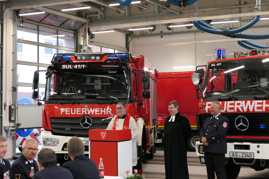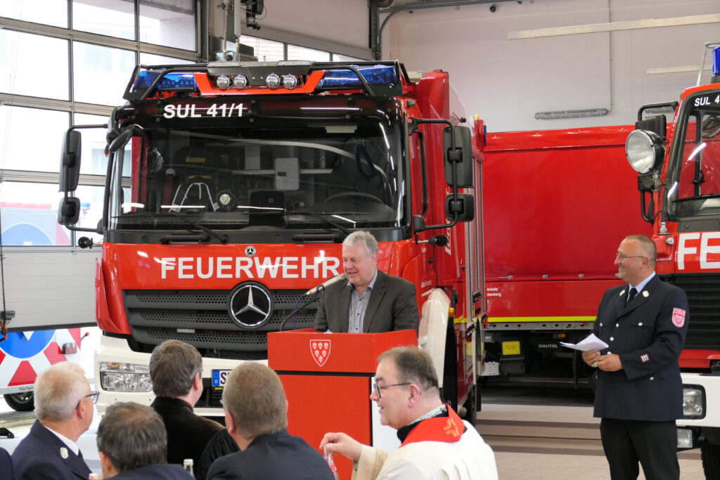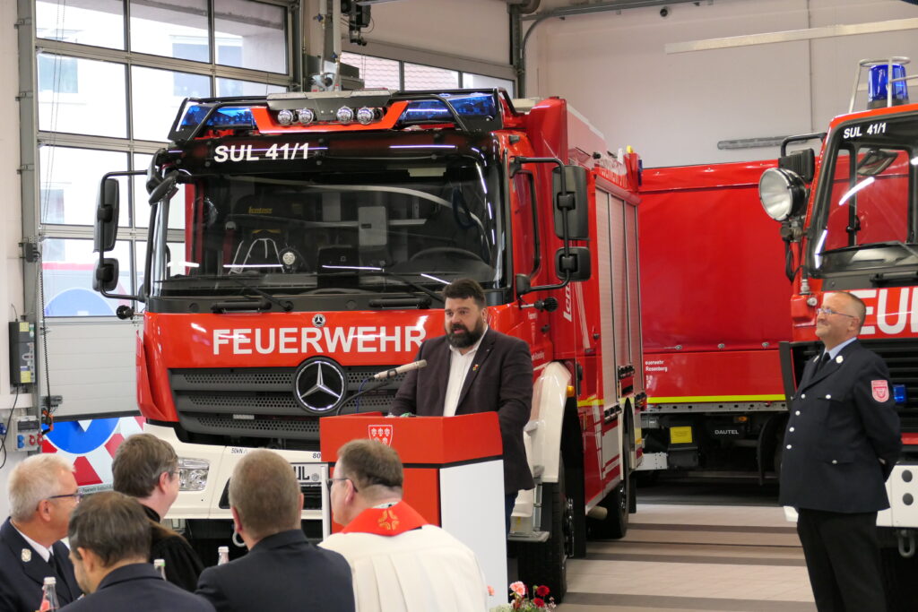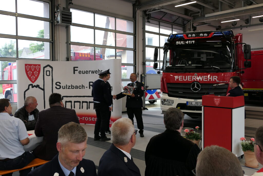 Armin Buchwald eröffnete die Veranstaltung und begann mit der Wichtig- und Notwendigkeit einer solchen Anschaffung. Anschließend gab er einen Einblick in die Ausstattung und Einsatzbereiche des neuen Fahrzeugs. Es folgten Grußworte von Bürgermeister Stefan Frank, bei welchen es auch zur offiziellen Schlüsselübergabe an Armin Buchwald kam, und Landrat Richard Reisinger. Danach segneten die Herren Pfarrer Mader und Dr. Kurz das Fahrzeug, damit wir immer gesund und unfallfrei heimkehren. Auch unsere Freunde aus Wernesgrün hatten neben Grußworten auch noch ein gelungenes Geschenk für uns. Gemeinsam feierten wir die Indienststellung gemütlich in unserer Fahrzeughalle.